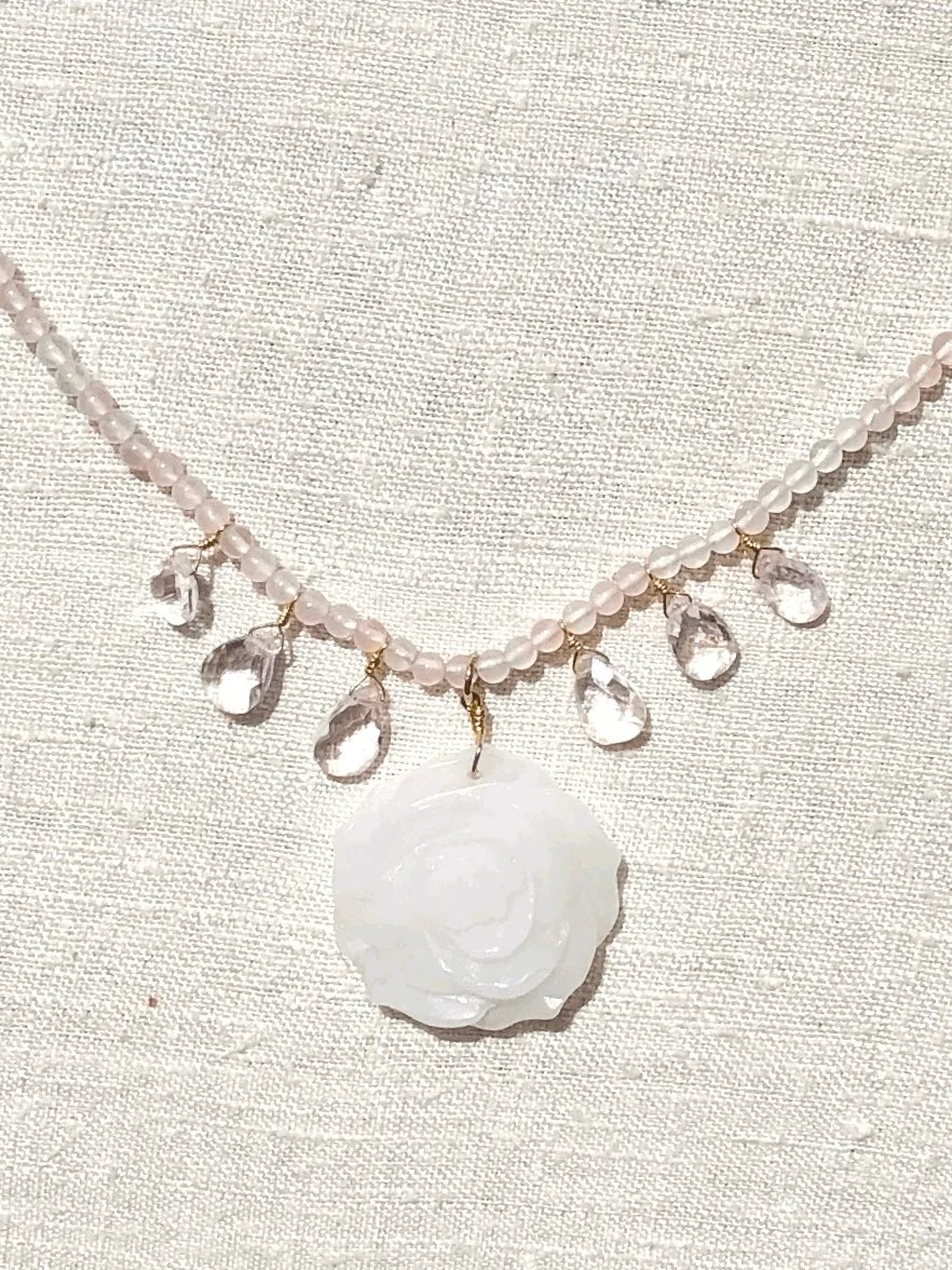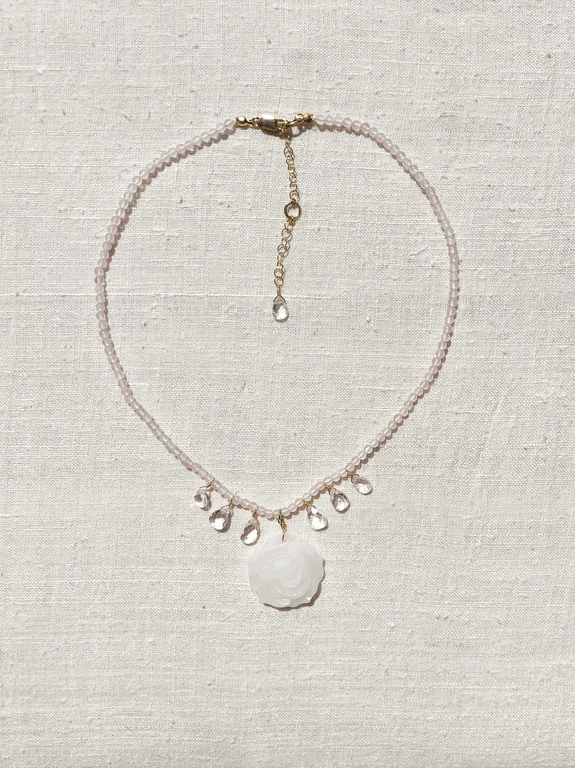 A symbol of longevity and abundance, a white jade carved flower hangs from a necklace hand-strung on silk cord and adorned with pale pink faceted morganite drops.